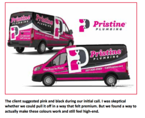 Do the research. We always start the brand process by reviewing all of the client’s competitors’ current brands and vehicle wraps. It’s important to use this research to help formulate the colour strategy.